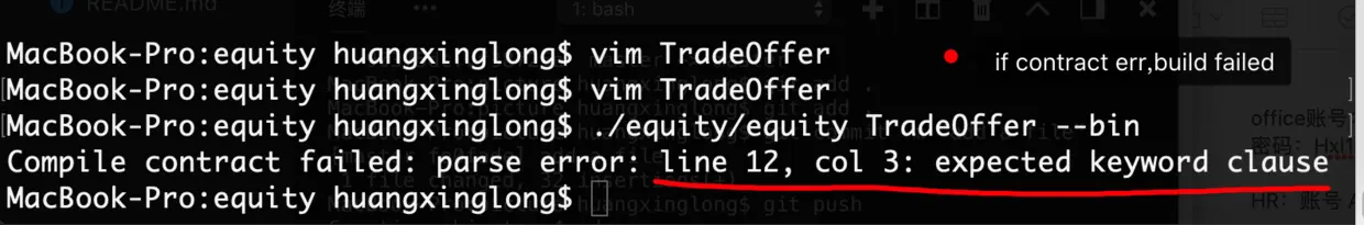 然后编写合约,我是用vim编译的合约,大家可以自行选择用vim或者编辑器编写合约。如果编译合约的过程中存在问题,请参考合约开发文档:bytom.github.io/mydoc_RPC_c…。下图是我在vim中编写的合约。
