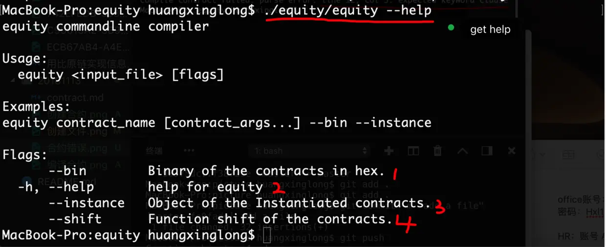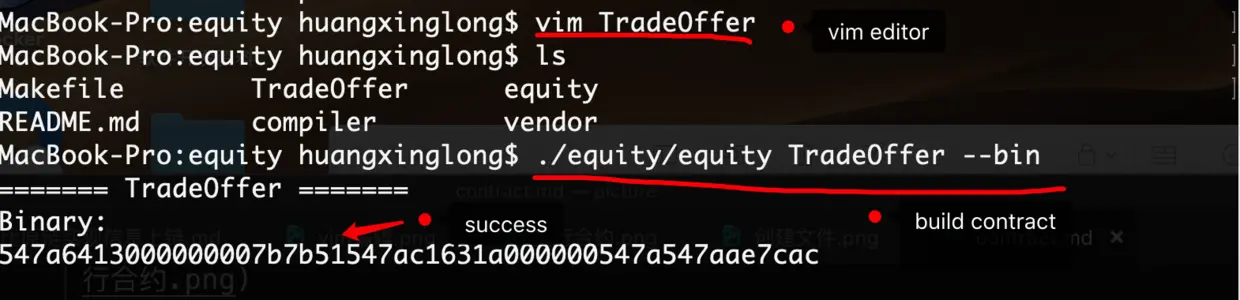 检查无误以后,在对应的目录下面执行合约文件,然后就可以输出下图所示的二进制。说明合约编写成功