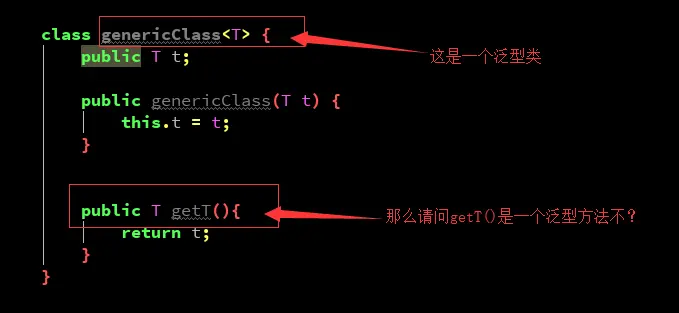 getT()方法虽然使用了泛型,但它的泛型是在泛型类中已经声明了的泛型,所以它才可以使用这个T泛型,getT()不是泛型方法,它算是一个普通成员方法。