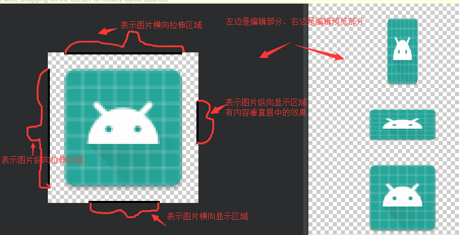正常图片都有四个边,.9图的左上(左边和上边两条边)表示可以拉伸区域,其中上面黑线(或者点)表示横向可拉伸的区域;左边黑线(或者点)表示纵向可拉伸的区域.在图片拉伸时只有黑线区域内的图像会被拉伸,黑线两边的图像保持原状。
