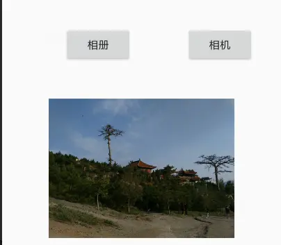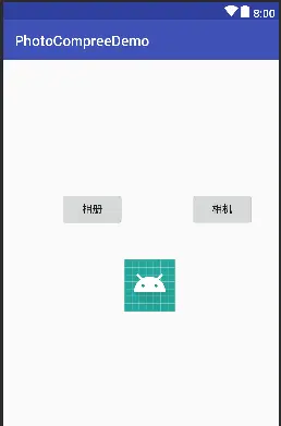 我们的界面也很简单,就是两个按钮,分别是拍照和相册选择,一个ImageView,用来显示压缩后的图片,如图: