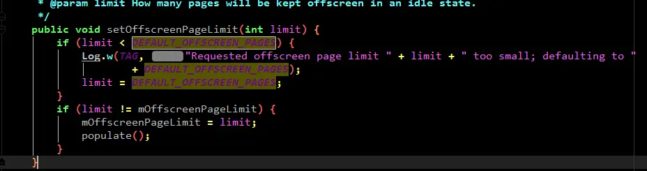 之前想既然setOffscreenPageLimit可以设置,那我就将其设置为0,结果“然并卵”,查看源码如下: