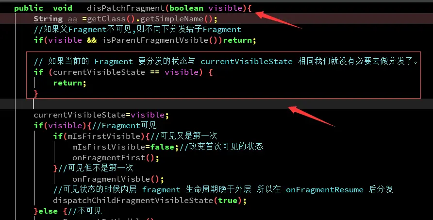 // 如果当前的 Fragment 要分发的状态与 currentVisibleState 相同(都为false)我们就没有必要去做分发了。