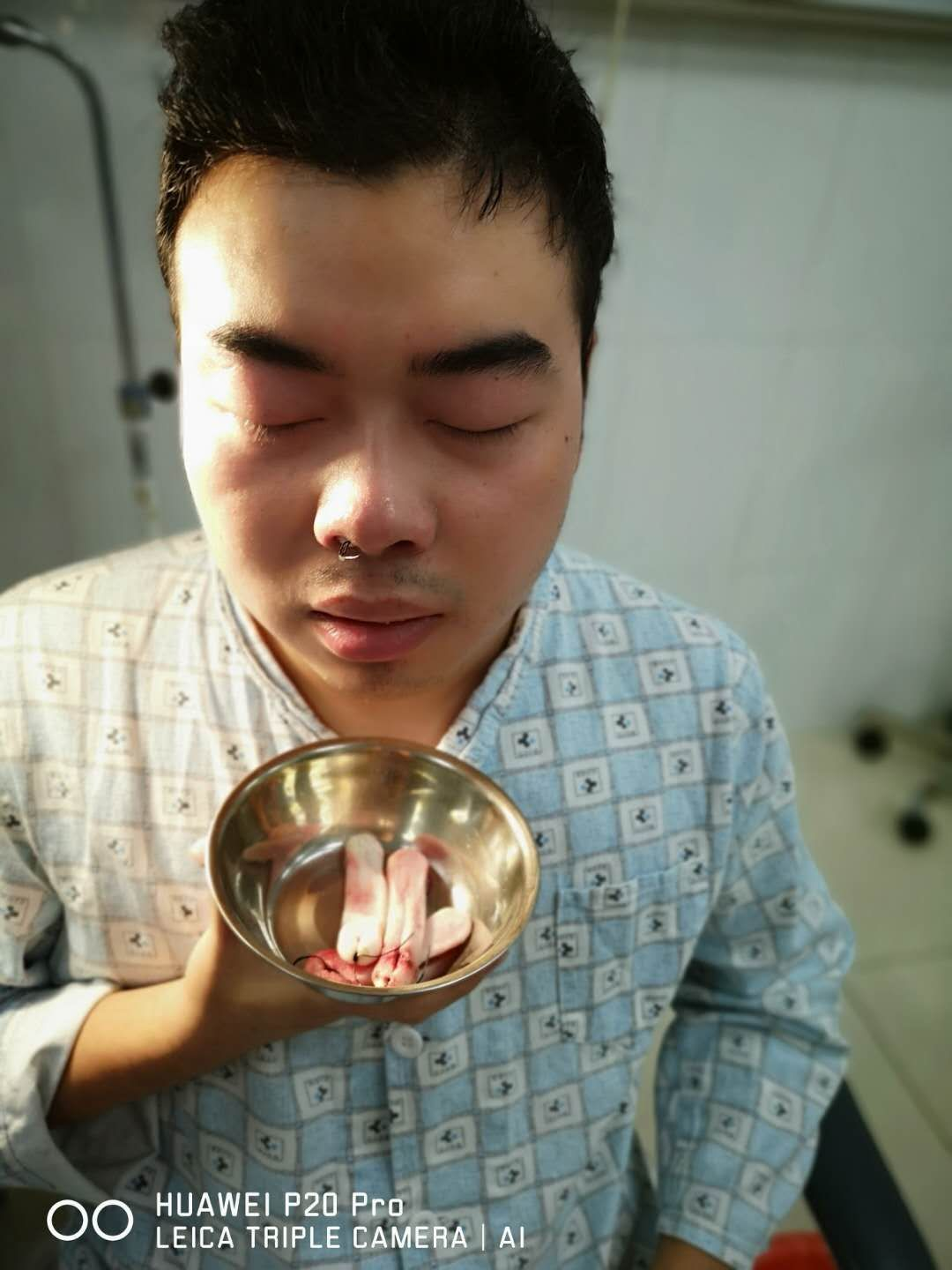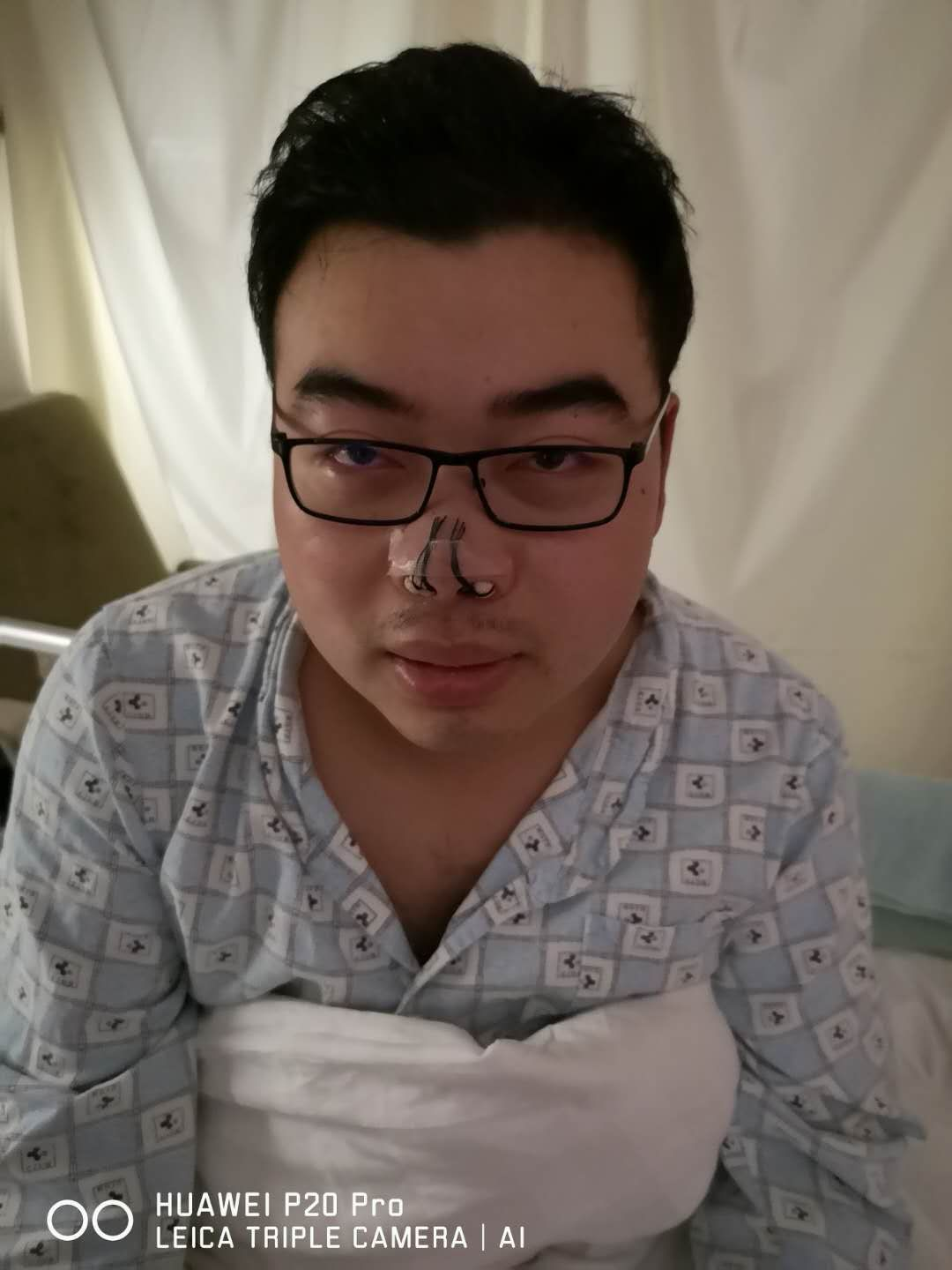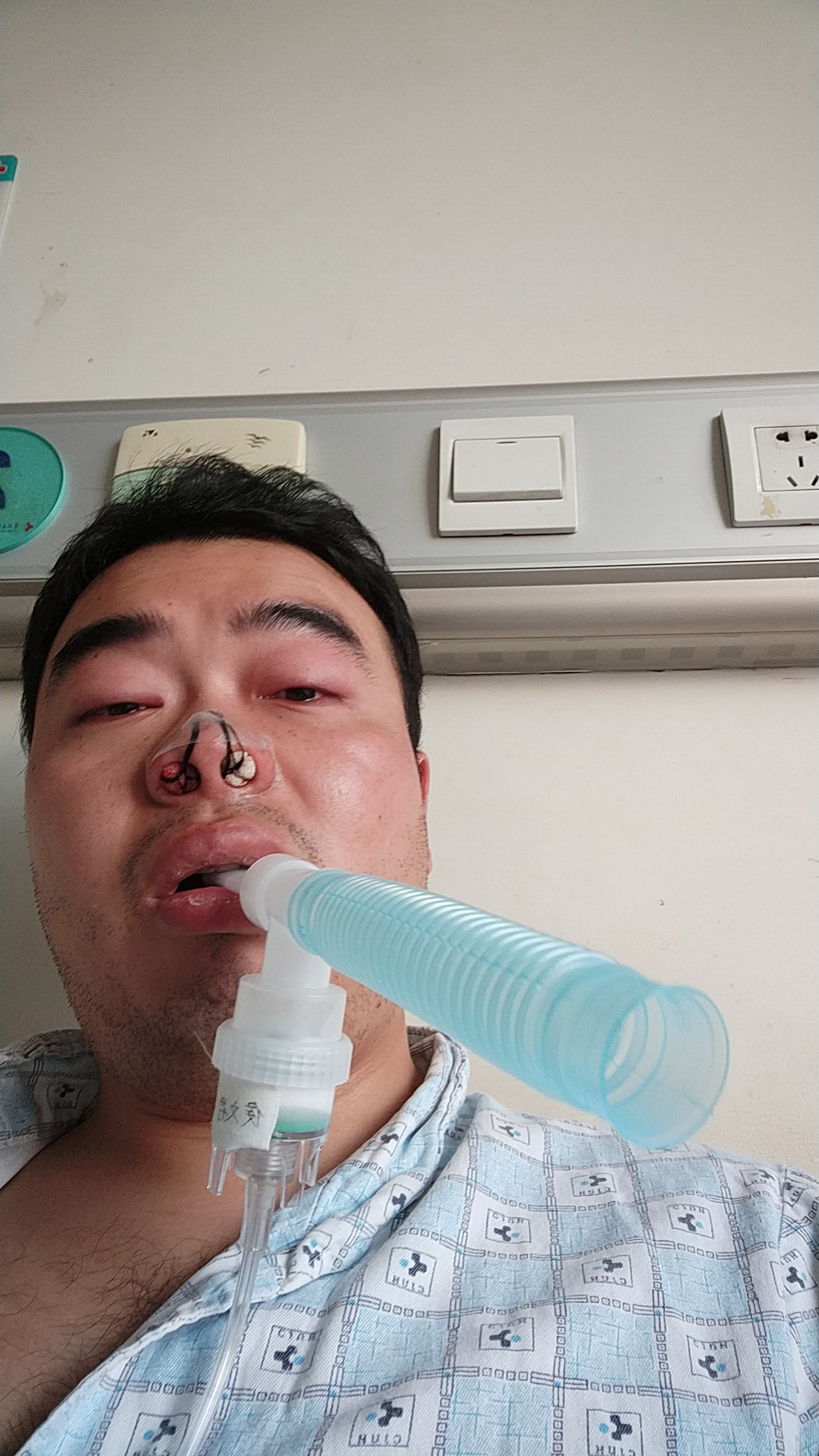 晚上约八点时,开始逐步恢复意识,发觉鼻中被放填充物(膨胀海绵),口中被安置雾化装置,手上打着消炎药,连着止痛泵。身体上连着心电、血氧、血压等监测装置,身体移动时鼻部有剧烈疼痛。因为只能口布呼吸,嘴唇干裂,上颚粘膜成萎缩状态,有强烈小便意,但是无法顺利排泄(全麻副作用)。后进食小米粥一碗,吞咽时会牵扯鼻部,痛。整夜小便六次,不爽。