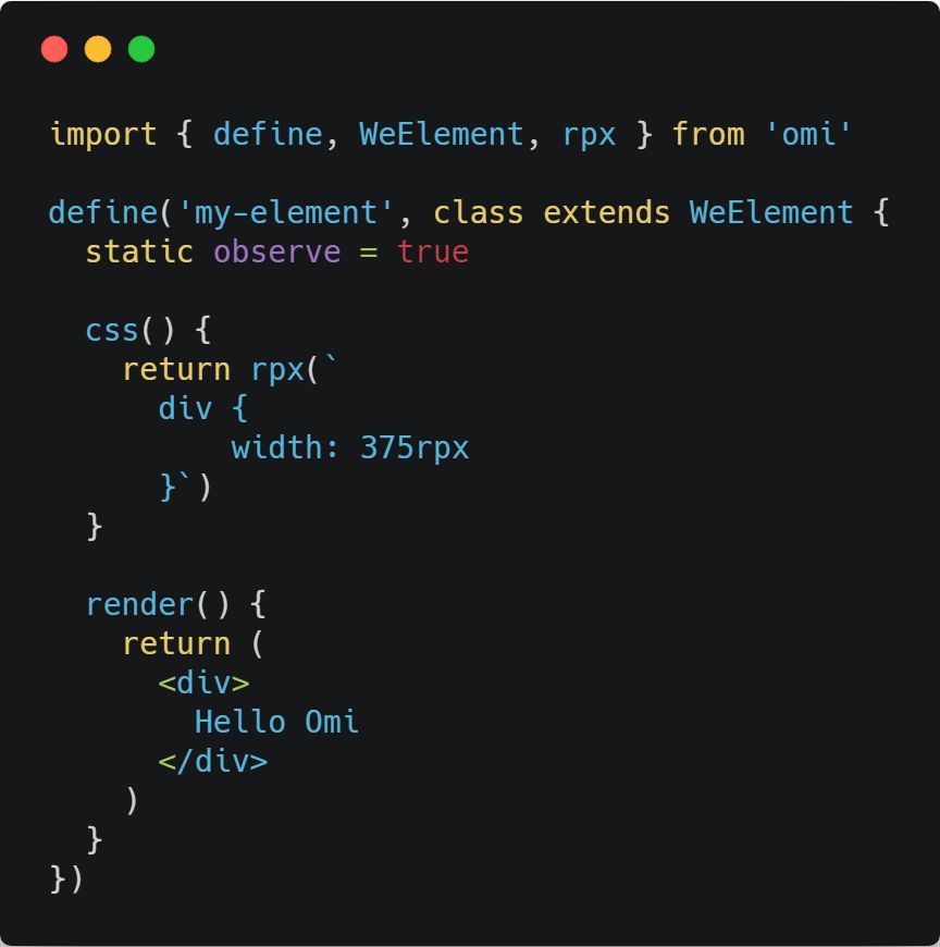 小程序支持 rpx 布局,Omi 也增强了 CSS, 支持基于 750 屏幕宽度支持 rpx 布局。比如定义一个半屏宽度的 div: