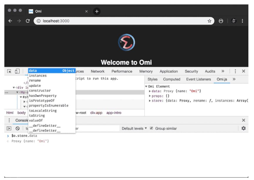 你可以同时使用 OMI 开发这工具或者微信开发者工具调试,既然 Omi 使用了 WebComponents 和 Shadow-DOM, 所以不需要像 React 一样安装其他元素面板,只需要使用Chrome 自带的 Elements' sidebar 便可,它和 React开发者工具一样强大。