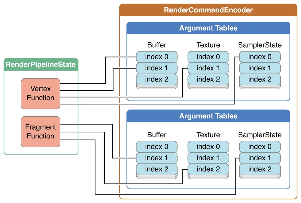 本节中讨论的MTLRenderCommandEncoder方法指定用作顶点和片段着色器函数的参数的资源,这些函数由MTLRenderPipelineState对象中的vertexFunction和fragmentFunction属性指定。 这些方法将着色器资源(缓冲区,纹理和采样器)分配给渲染命令编码器中对应的参数表索引(atIndex),如图5-3所示。