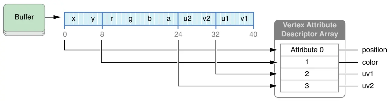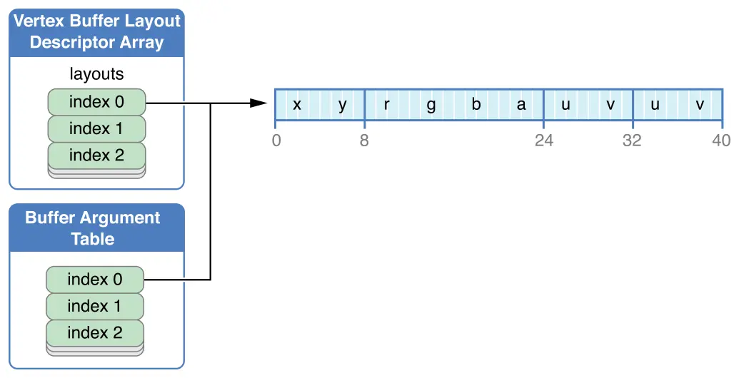 在Metal框架代码中,每个管道状态可以有一个MTLVertexDescriptor,用于描述输入到顶点着色器函数的数据的组织,并在着色语言和框架代码之间共享资源位置信息。