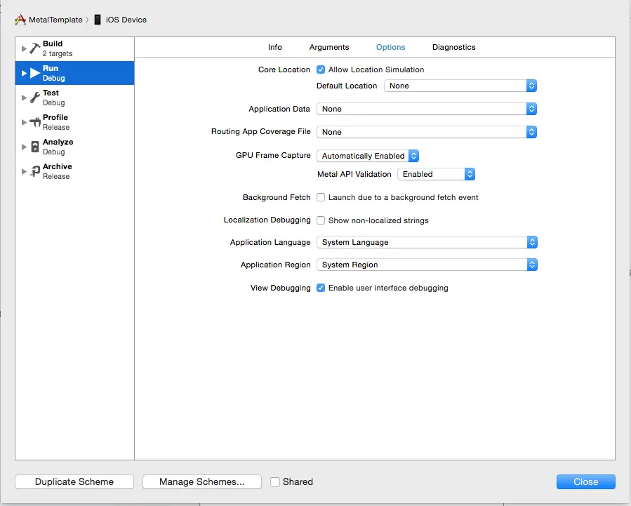 当Metal应用程序从Xcode运行时,默认Scheme设置会降低性能。 Xcode检测源代码中是否使用了Metal API,并自动启用GPU Frame Capture和Metal API Validation设置,如图8-2所示。 启用GPU Frame Capture时,将激活调试层。 启用Metal API Validation后,将验证每个调用,这会进一步影响性能。 对于这两种设置,CPU性能比GPU性能更受影响。 除非您禁用这些设置,否则当应用程序在Xcode之外运行时,应用程序性能可能会显着提高。