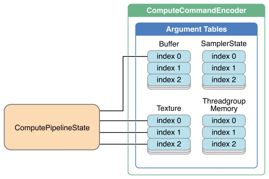 MTLFunction对象表示使用Metal着色语言编写的计算函数,如Functions and Libraries中所述。 - 2) 指定计算命令编码器要使用的MTLComputePipelineState对象,如Specifying a Compute State and Resources for a Compute Command Encoder中所述。