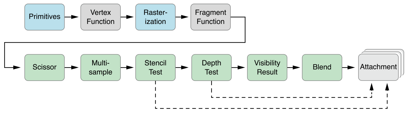 MTLRenderCommandEncoder对象。请参阅Using the Render Pass Descriptor to Create a Render Command Encoder。 - 3) 创建一个MTLRenderPipelineState对象,以定义一个或多个绘制调用的图形渲染管道的状态(包括着色器,混合,多重采样和可见性测试)。要使用此渲染管道状态来绘制基元,请调用