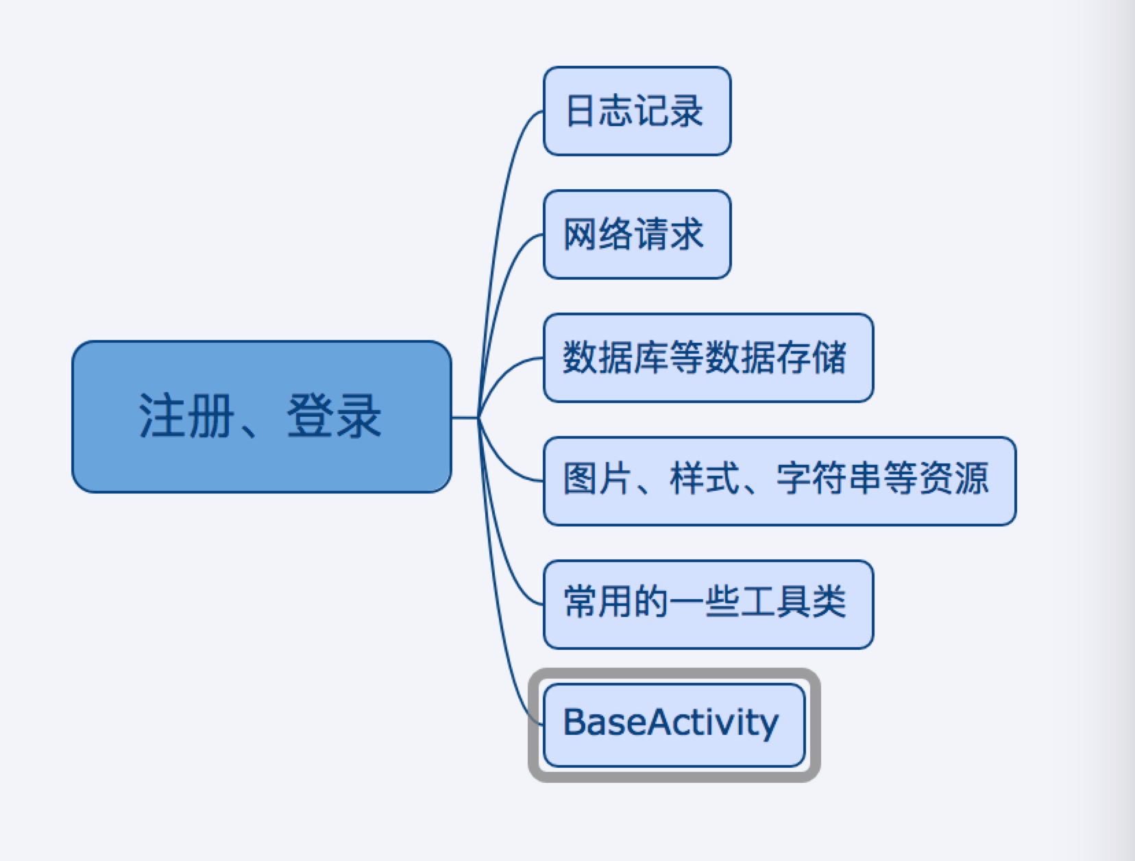我们把老工程的代码复制过来之后,发现依赖的资源太多了,压根没法编译运行。既然我想把“注册、登录”这个业务模块做成一个独立的组件,那么这个业务模块里所依赖的其他资源,是不是也得是个独立的组件。同样,采用xmind画出“注册、登录”这个业务所依赖的其他资源,如下图所示:
