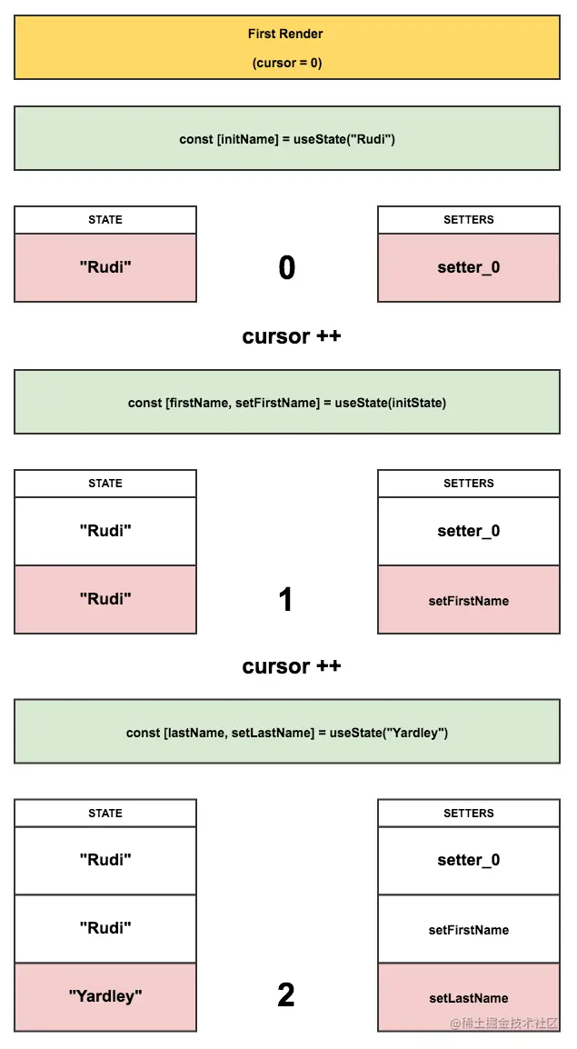 后续的每一次渲染过程当中 cursor 都将被重置,而渲染的值都只是从每一次的数组当中取出来的。