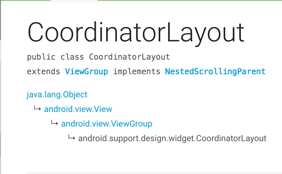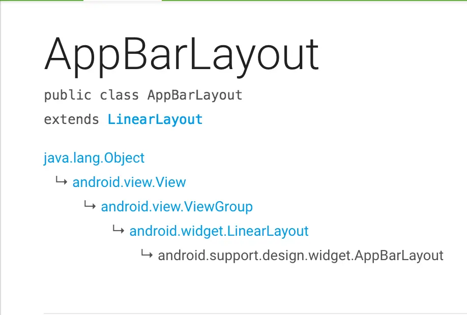 从上图继承结构上可以看出,AppBarLayout从本质上就是一个垂直的LinearLayout,只是它为了实现交互动画效果增加了一些滑动特性,基本上严重依赖于协调者布局CoordinatorLayout。如果你将AppBarLayout放置在一个其它的ViewGroup中,这些滑动特性将不起作用,而此处的AppBarLayout也就是失去了原本存在的意义。