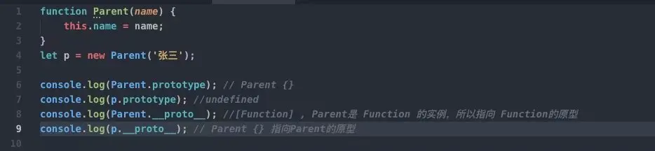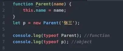 通过上面的分析,我们知道 p 是 object 的类型,Parent 是 Function 类型。 在 java中,如果你这么写,那么 Parent 应该是一个类(class),但是 javascript 中并没有类,但是我们又很想借鉴这种语法形式,应该怎么办呢,这个任务只能交给 Function。 看下完整代码: