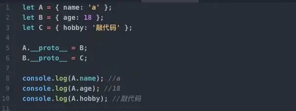 简单总结javascript继承的本质: 一个对象 A的__proto__属性指向的那个对象B,B就是 A 的原型对象(或者叫父对象),对象 A 可以使用对象 B 中的属性和方法,同时也可以使用对象 B 的 原型对象C 上的属性和方法,以此递归,就是所谓的原型链