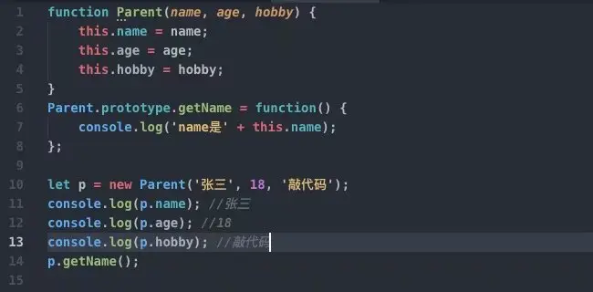 - 第一步:Parent 被执行。当使用 new关键字时,Parent 函数会在 p 的作用域下被执行,所以这里的 this 就是实例p,这样,name,age,hobby三个属性才会被当做 p 的属性被创建,