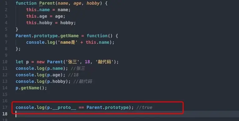 - 第二步:将 p.__proto__指向 Parent.prototype,这才是构造函数的精髓所在,所以,p 就继承了 Parent.prototype中的(以及其原型链上的)属性和方法。验证如下: