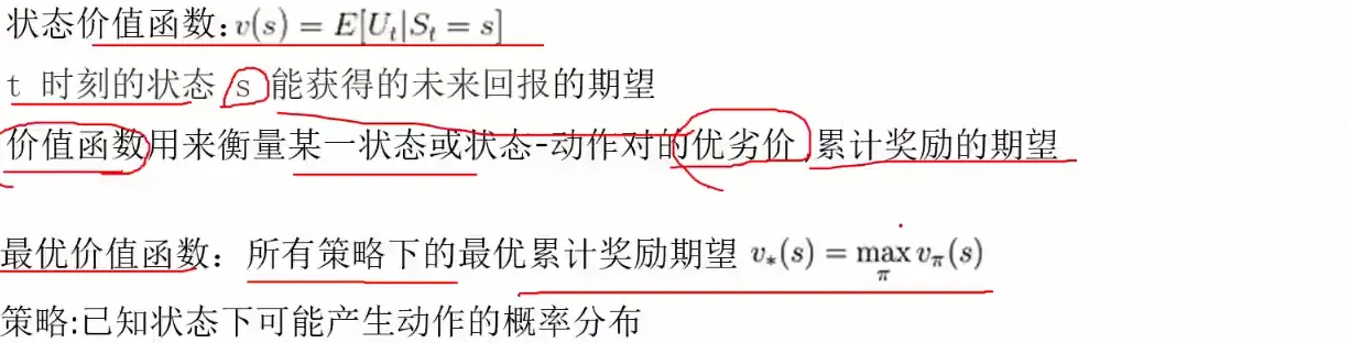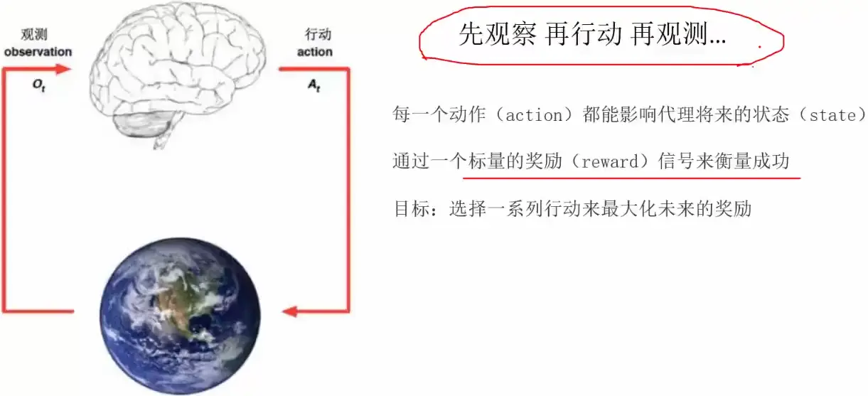 奖励:每一步行为之后都会有一个结果,对不同的结果都会有一个奖励的值,如果你学习了我给你一个奖励,如果你打球了(没学习)我就给你一个惩罚。每一步操作都会有一个衡量的指标,来指明这一步操作是对还是不对。