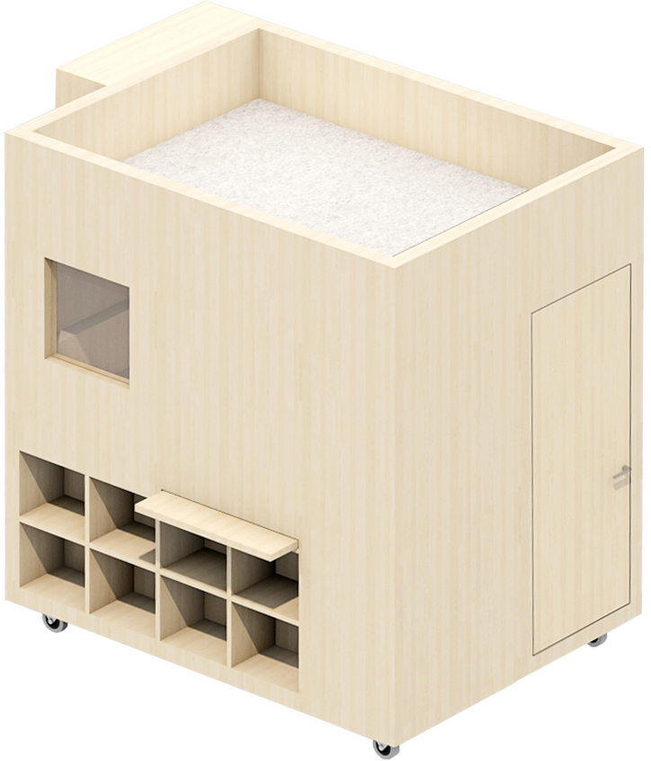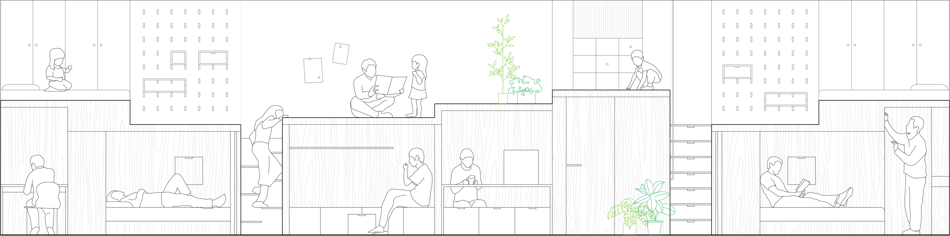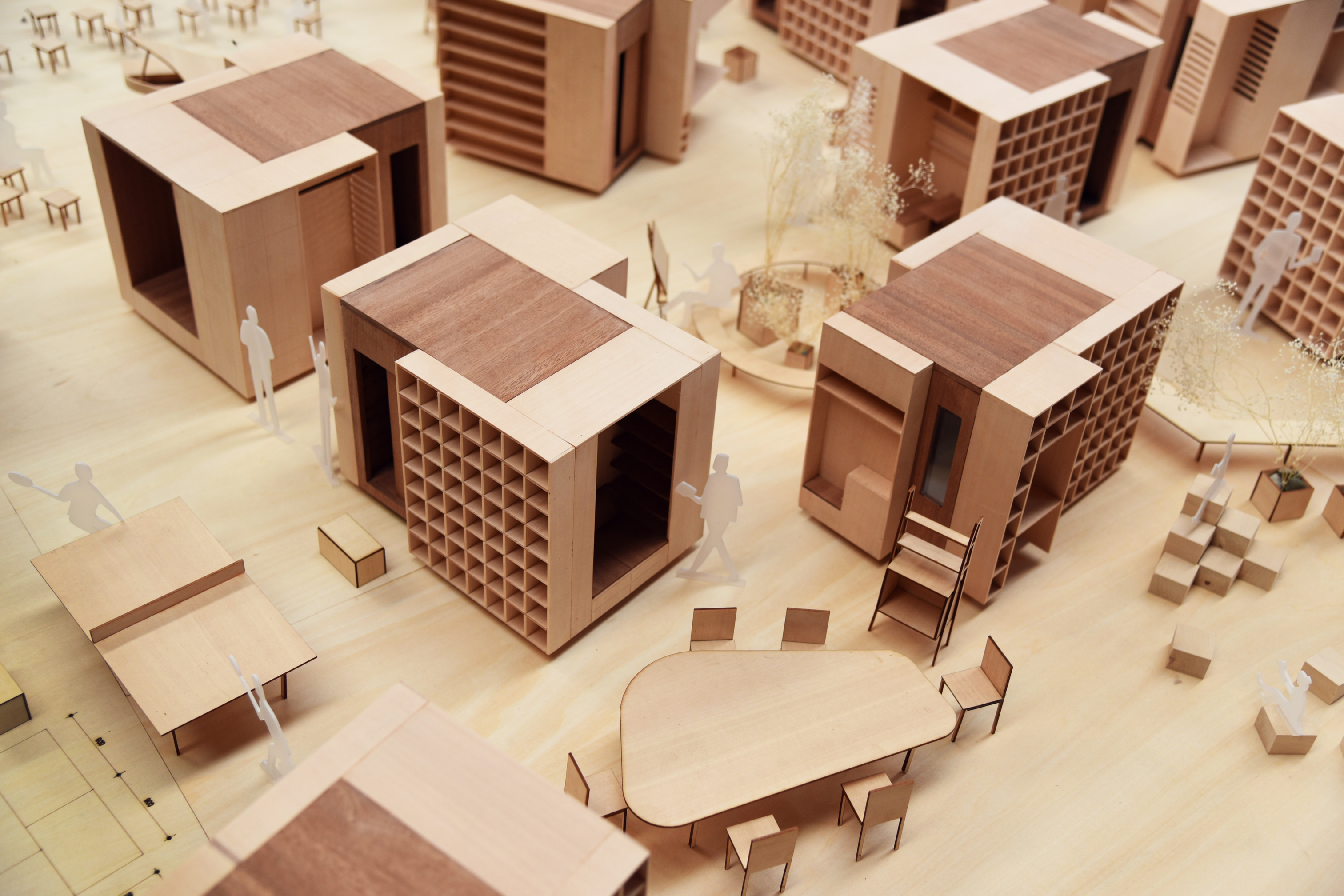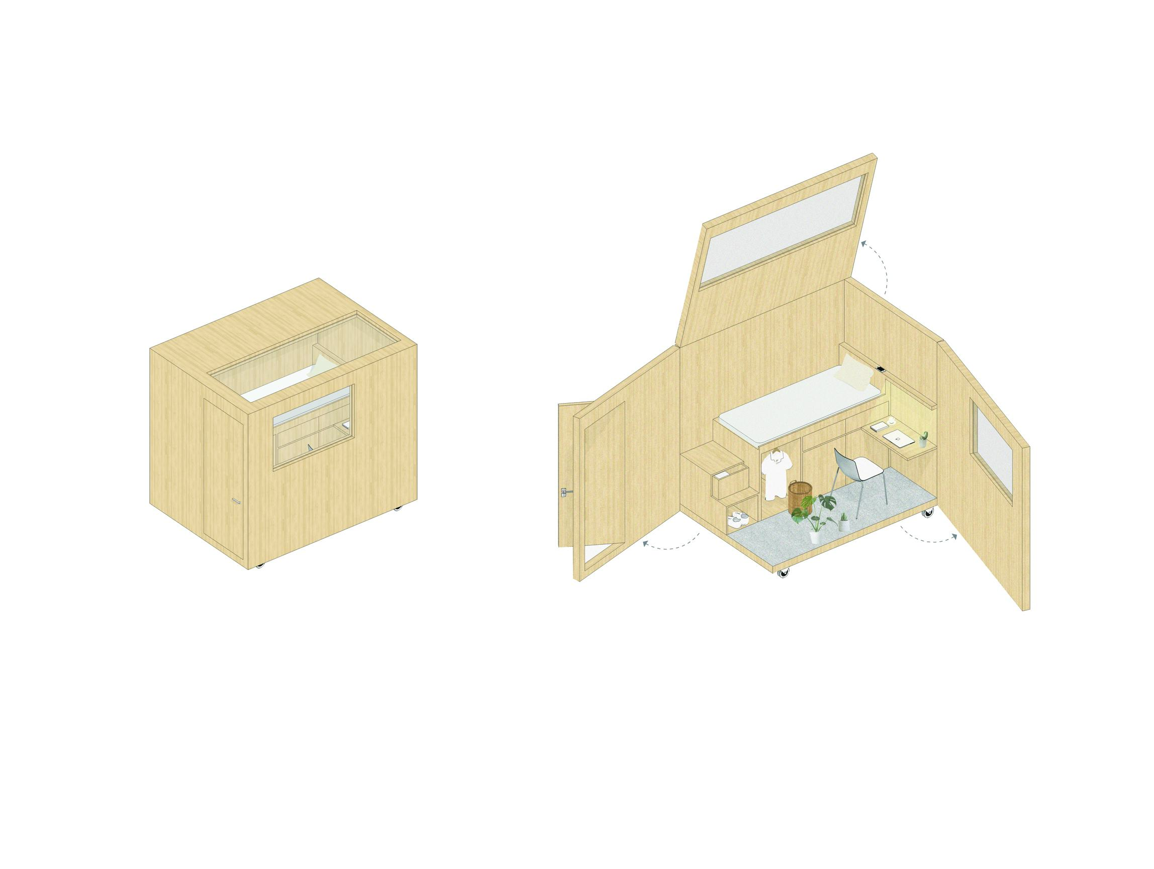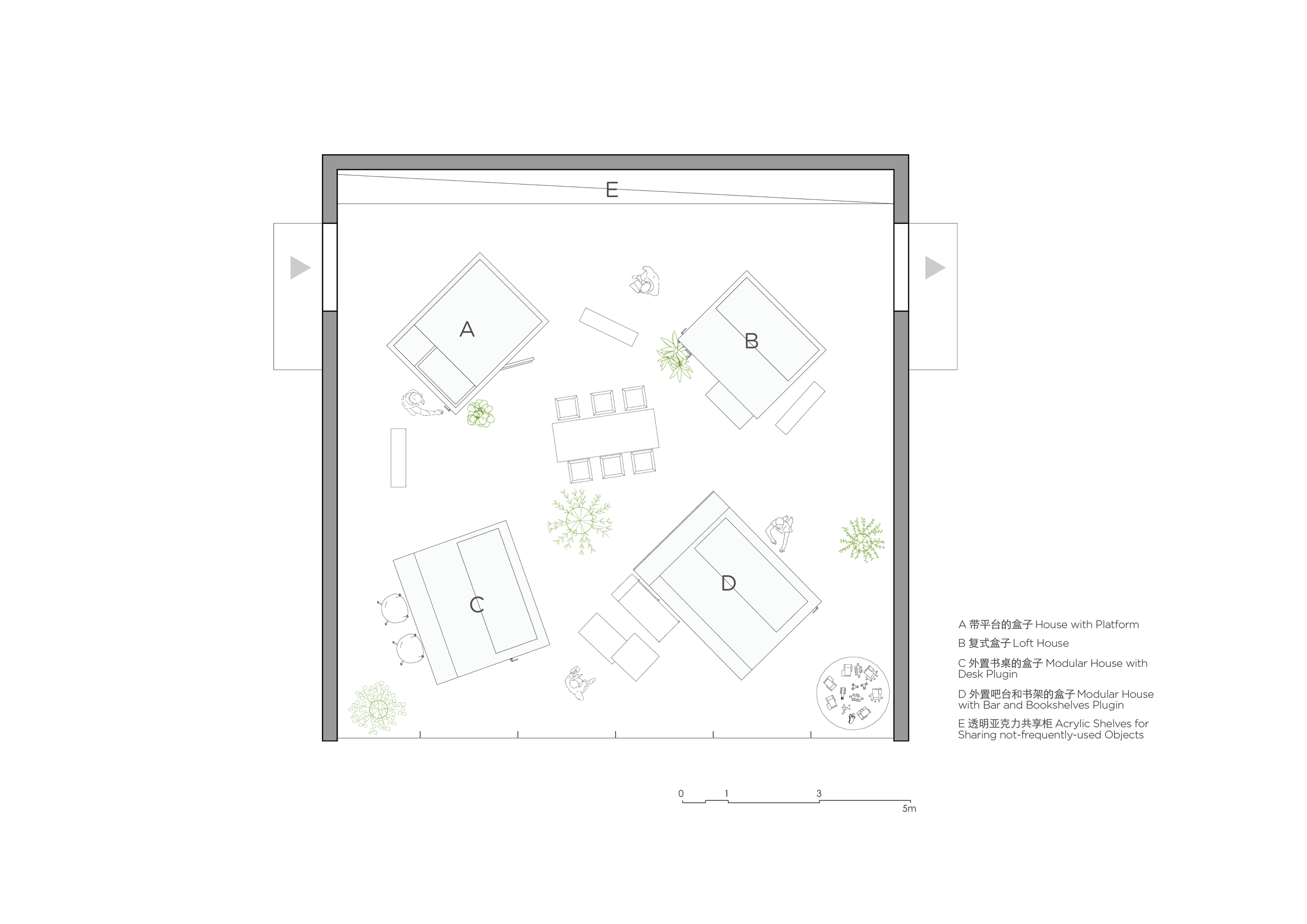 四个盒子营造着四种生活方式,每个盒子仅占地5平米左右,分为内外两个系统,内部系统偏私密一些,是统一的;外部系统偏个性化,可以根据自己的需求变换家具,因而可以有无数种盒子。