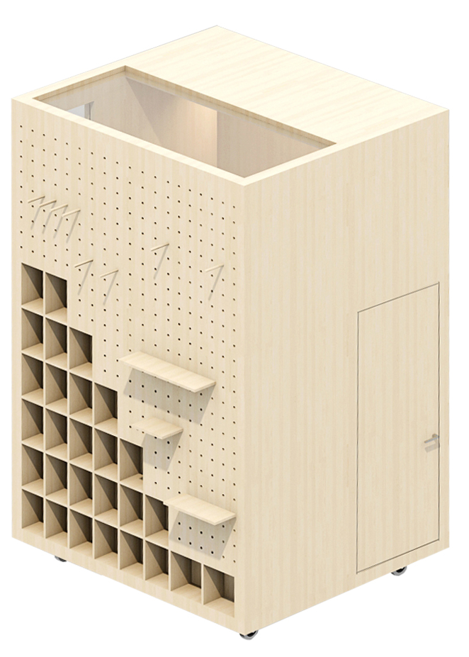 带书架的复式盒子效果图,loft house with shelving space and multifunctional pegboard wall