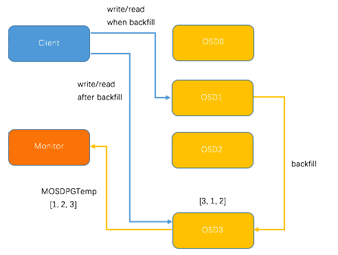 新加入的OSD3取代了原有的 OSD0 成为 Primary OSD, 由于 OSD3 上未创建 PG , 不存在数据,那么 PG 上的 I/O 无法进行,因此,这里引入 PG Temp 机制,即 OSD3 向 Monitor 发送 MOSDPG Temp,把 Primary OSD 指定为OSD1, 因为 OSD1 上保存了 PG 的数据,Client 发送到 PG 的请求都被转发到了 OSD1;与此同时,OSD1 向 OSD3 发送 PG 的数据,直到 PG 数据复制完成,OSD1 将 Primary OSD 的角色交还给 OSD3,Client 的 I/O 请求直接发送的 OSD3,这样就完成了 PG 的迁移。整个过程如下图所示。