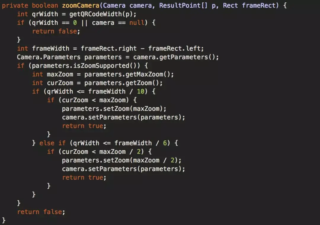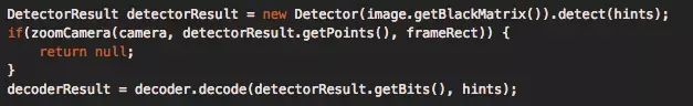 第一步只是检测是否存在二维码,比如去寻找是否存在Position Detection Pattern,Timing Pattern,Alignment Pattern。如果检测到了,则返回DetectorResult,内部包含了定位点的位置信息;如果没检测到,则抛出NotFoundException。如果二维码很小,即使第一步检测存在二维码,但是第二步解码也可能会失败。由于我们在第一步已经能够知道二维码的大小,因此根据DetectorResult返回的二维码定位点信息计算出二维码的大致宽度,然后判断二维码大小在扫码框中是否足够小,如果足够小,则放大一定焦距:如果小于十分之一,则放大到最大焦距;如果小于等于六分之一,则放大到最大焦距的一半。