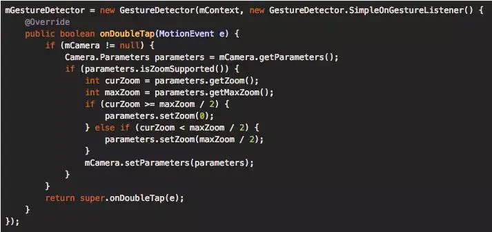 原本Lark的二维码扫描中没有调整焦距的功能,这个对于一些特定场景下会不太方便,因此这里加入了双击放大的功能能够对焦距进行粗略的调整。利用GestureDetector的onDoubleTap()回调捕捉用户双击事件,并在CameraPreview中的onTouchEvent()中添加mGestureDetector.onTouchEvent()。实现如下: