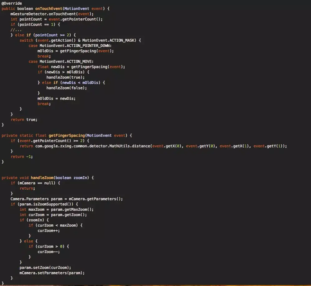 为了更精细化的让用户调整焦距,我们提供了手势来缩放焦距。通过在onTouchEvent()中获取用户两个手指的距离是越来越近还是越来越远来调整焦距。代码如下: