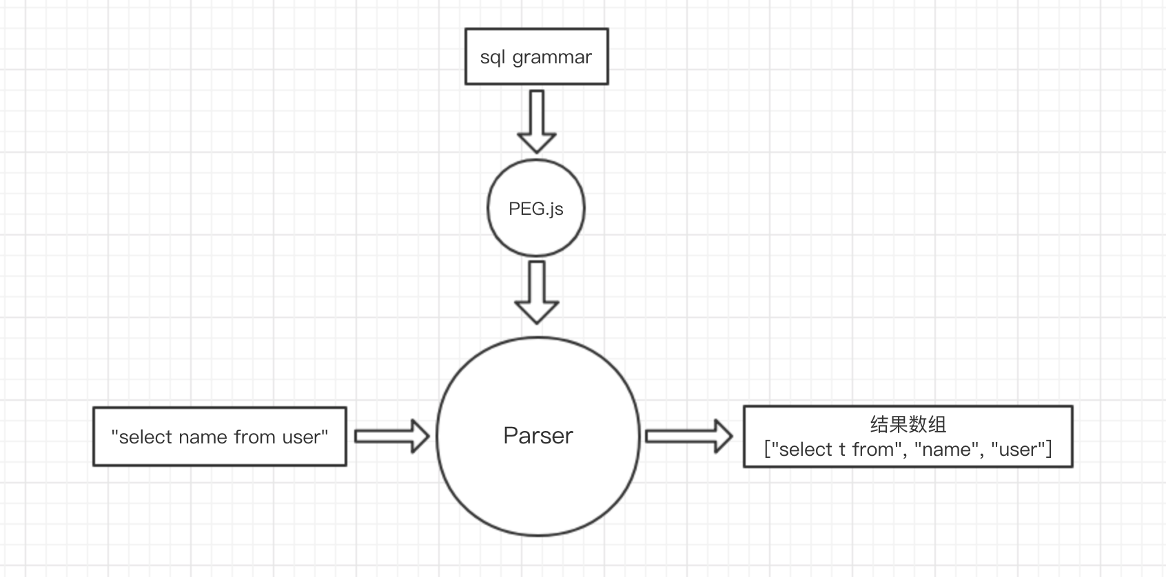 PEG.js 是一个 parser generator ,它会将我们用 PEG.js 语法编写的 sql 语法文件转化为可以直接运行的 parser , 而我们也是通过这个parser去解析 sql 语句。所以我们的工作就是编写 sql 语法文件。