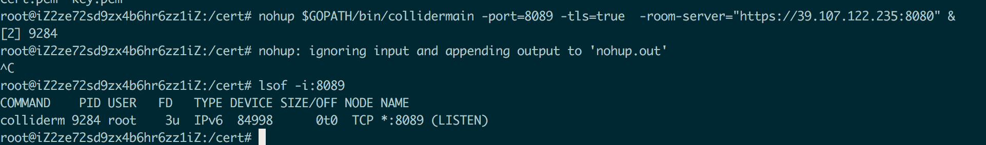 nohup $GOPATH/bin/collidermain -port=8089 -tls=true -room-server="https://39.107.122.235:8080" &