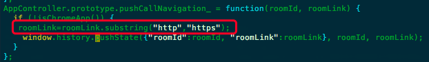 vim /root/webrtc/apprtc/out/app_engine/js/apprtc.debug.js #搜索 pushState 增加: roomLink=roomLink.substring("http","https");