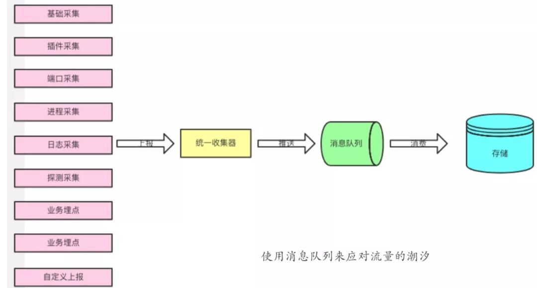 在数据上报的链路建设中,可以考虑使用消息队列来应对流量的潮汐。因为监控数据的上报,尤其是用户自定义数据的上报,很可能不是均匀的,会与流量、业务峰谷有关。此时通过一个消息队列来缓冲大批量的没有时间处理的数据,是一个不错的选择。