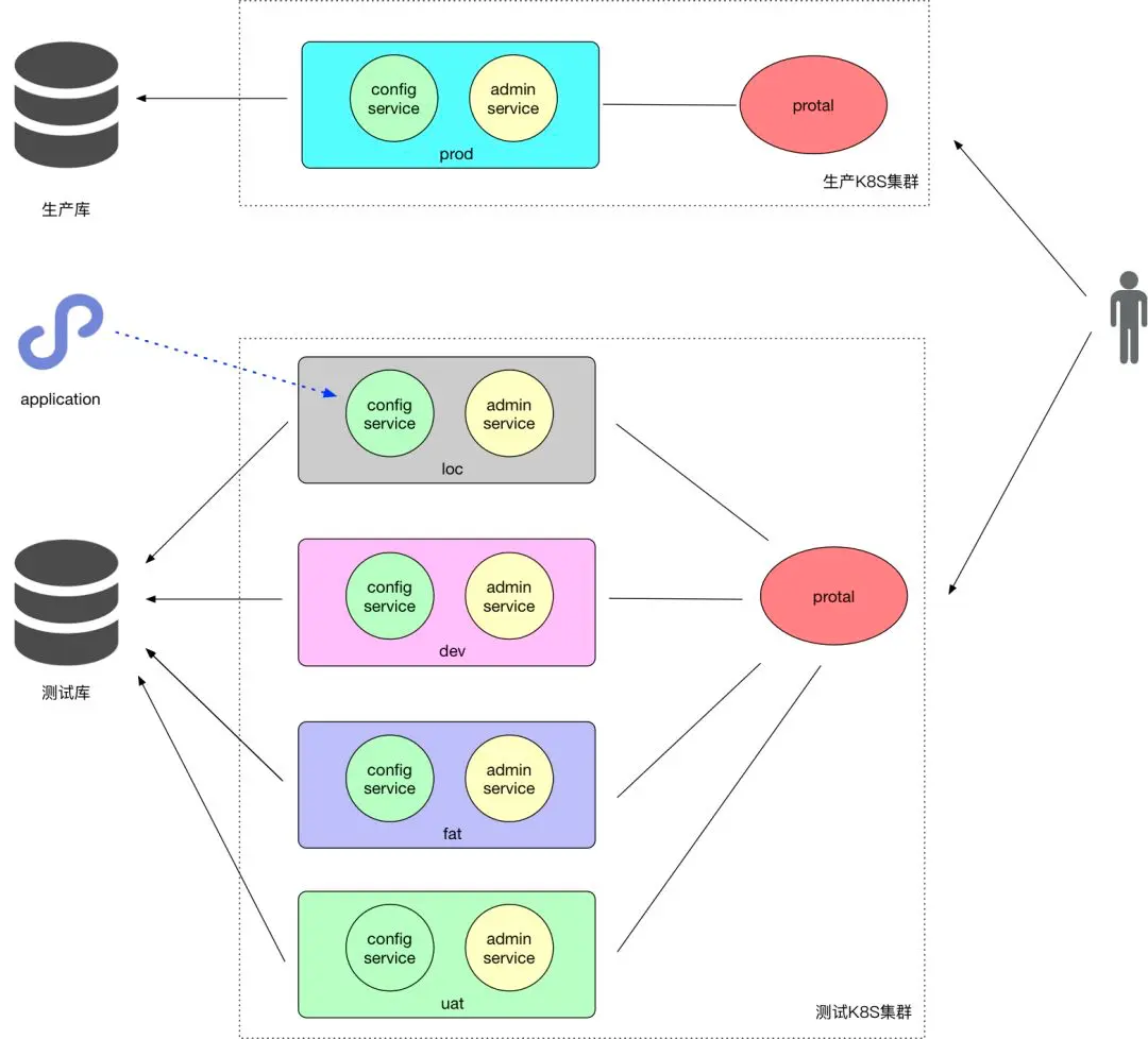 所有非生产环境对应一个 portal,每个环境独立部署 config service 和 admin service,其中生产环境在单独的 k8s 集群中(单独对生产环境做了隔离,是因为 Apollo 的权限管理还不够强大,不支持区分环境的访问权限)。