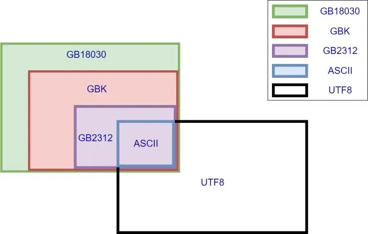 图中我们可以看出,ASCII被所有编码兼容,而最常见的UTF8与GBK之间除了ASCII部分之外没有交集,这也是平时业务中最常见的导致乱码场景,使用UTF8去读取GBK编码的文字,可能会看到各种乱码。而GB系列的几种编码,GB18030兼容GBK,GBK又兼容GB2312,下文细讲。