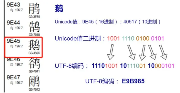 举例说明,中文“鹅”字,Unicode十进制值为40517(16进制为9E45,2进制为1001 1110 0100 0101)。这个2进制值长度为12位,查询上面表格发现,二字节不够表示,四字节太长,三字节刚好,因此可以表示为 11101001 10111001 10000101,换算为16进制即E9B985,这就是“鹅”字的UTF8编码,占3字节。另外,经查询,“鹅”的GBK编码为B6EC,和UTF8的值完全不相干。
