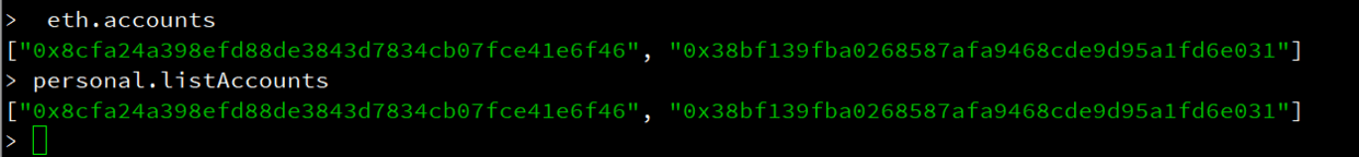 回车后,返回一个账户数组,里面有一个默认账户, 也可以使用personal.listAccounts查看账户。