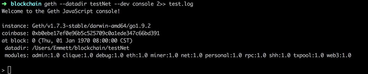 执行命名后,会进入geth控制台,这时光标停在一个向右的箭头处,像这样:
