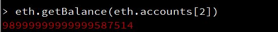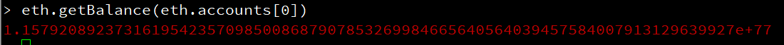 eth.getBalance(eth.accounts[0])表示账户列表第一个账户 回车后,可以看到大量的余额,如: