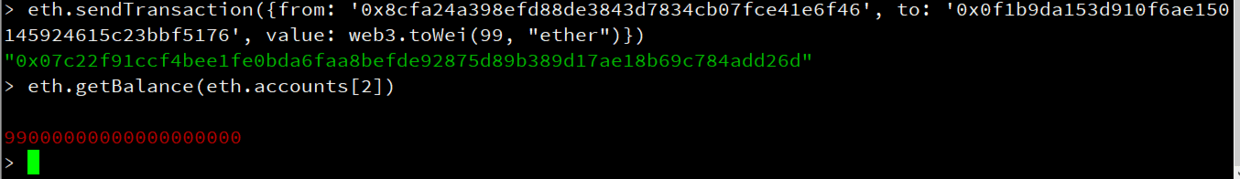 eth.sendTransaction({from: '0x8cfa24a398efd88de3843d7834cb07fce41e6f46', to: '0x0f1b9da153d910f6ae150145924615c23bbf5176', value: web3.toWei(99, "ether")})