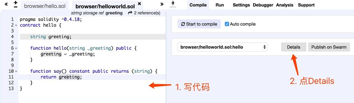 简单解释下,我们定义了一个名为hello的合约,在合约初始化时保存了一个字符串(我们会传入hello world),每次调用say返回字符串。 把这段代码写(拷贝)到Browser-Solidity,如果没有错误,点击Details获取部署代码,如: