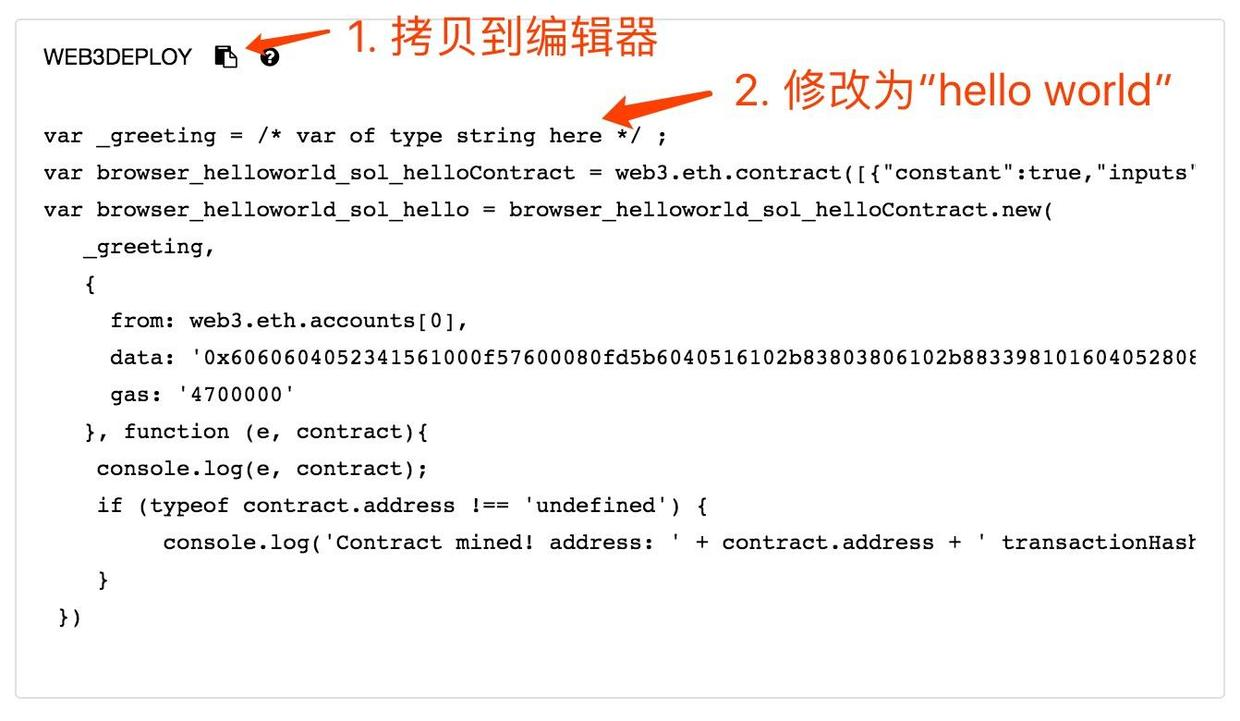 【注意】 第1行:修改变量名为_geeting5, 修改字符串为Hello World 第2行:合约变量名为helloContract5,里面引用改为_greeting5 第3行:修改合约实例变量名为helloContract5,之后可以直接用实例调用函数。 第6行:修改部署账户为新账户索引,此处改为[2],即使用新账户来部署合约。 第8行:准备付的gas费用,IDE已经帮我们预估好了。 第9行:设置部署回调函数。 其中变量名为全局的,_geeting5仅为举例表示新定义的变量。