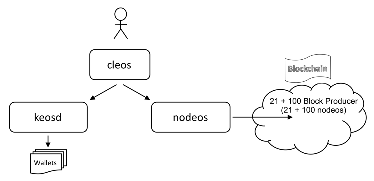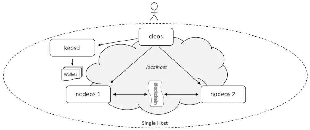 本地单节点的情况下,仅需要 nodeos 和 cleos,不需要 keosd,因为用节点的钱包插件管理私钥即可。这一个节点就是区块链的全部,所有的数据均储存在单一节点中。所以下图中的“BlockChian”只是一个概念,所有的出块工作全都在 nodeos 中搞定。