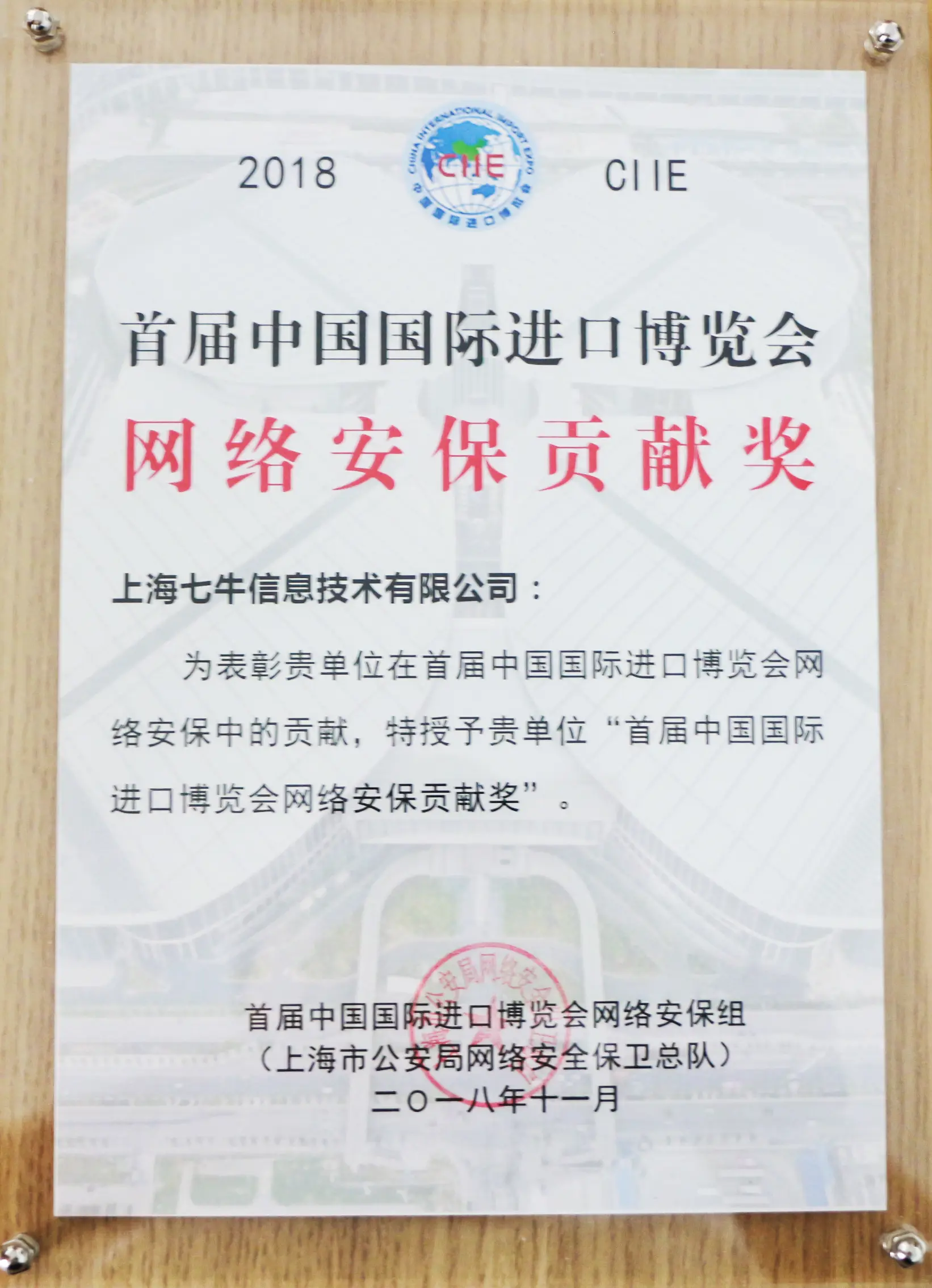 11 月 10 日,首届中国国际进口博览会网络安全保卫组颁奖仪式在沪举行,重点表彰在本次进口博览会网络安全保卫项目中作出突出贡献的单位。上海七牛信息技术有限公司(以下简称七牛云)作为国内领先的以数据智能和视觉智能为核心的企业级云计算服务商受邀出席,并荣获「首届中国国际进口博览会网络安保贡献奖」。
