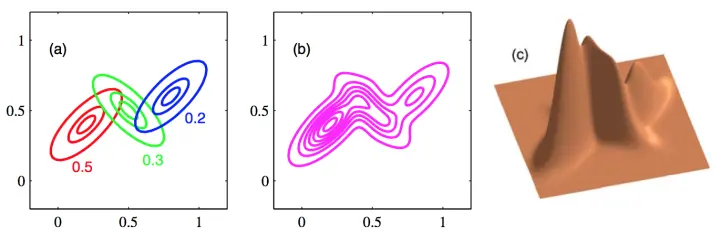 (a)为不同混合比例下的高斯概率密度分布(b)为混合状态下的概率密度分布(c)为概率密度分布的表面图。