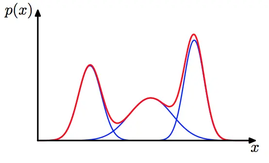 上图左面用单一高斯分布去描述,显然没有右图用两个高斯分布去描述的效果好。所以下面介绍高斯混合模型。