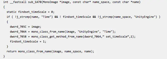 通过启动进程后附加,获取到Hook调用的函数,通过分析得知,mono_class_from_name函数是mono在解析DLL方法时会经过的一个函数,hook此函数后,在调用前,对参数中方法名、命名空间进行判断,最终通过调用mono_class_get_method_from_name获取到UnityEngine.Time.set_timeScale方法,该方法的作用便是设置游戏时间的流速。