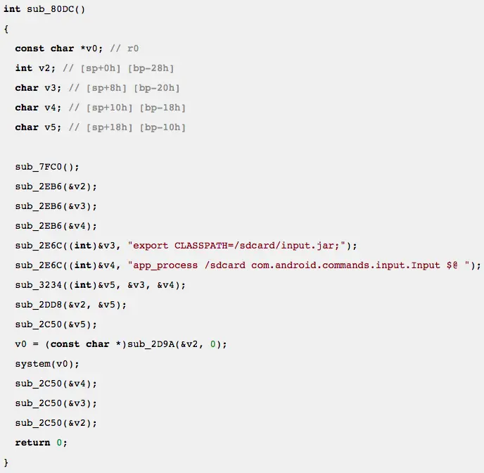 深入分析该框架类软件,发现它使用ROOT权限启动了一个疑似输入的可执行文件(/data/data/my.apk/app_data/input),从该路径下提取该可执行文件进行分析,从中找到了它使用app_process命令执行了一个名为input.jar的文件。