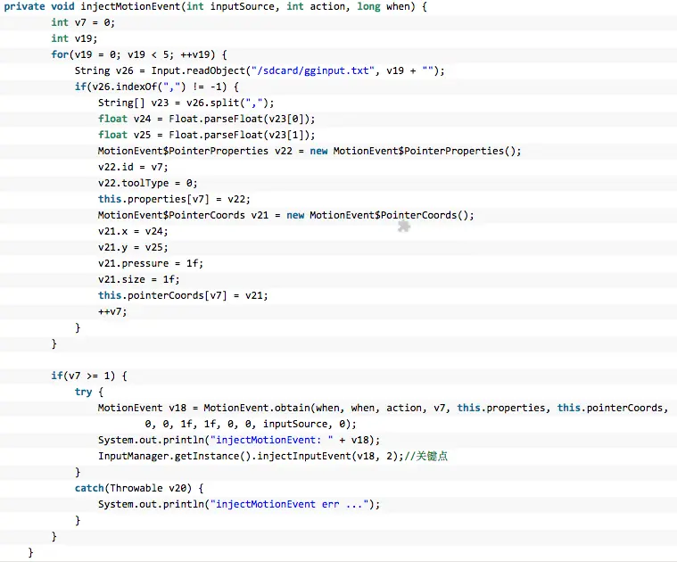 使用工具打开jar包查看,代码没有混淆,很轻易的就找到了关键的实现函数(具体实现原理可以参考《 Android中模拟点击类软件实现原理探究》,这里提到过同样实现的方法):