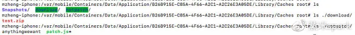 随后我们点击“Download and Unzip”,应用会通过http下载一个zip包到本地,并使用SSZipArchive库进行解压,如果我们采用DNS劫持将正常的zip包替换为恶意的zip包的话,虽然程序会将zip解压到download目录,但是我们成功利用目录穿越漏洞,让patch.js解压到了如下位置:/Library/Caches/download/../hotpatch/patch.js,并成功将正常的patch.js给替换成了恶意的patch.js: